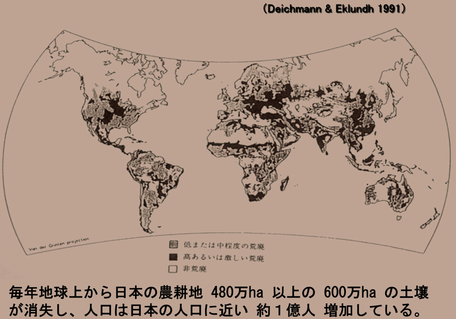 世界の中で特に土壌荒廃が進んでいる国はアメリカ──世界の半分の食料を生産している国です。続いてアフリカや地中海、ヨーロッパ、中国もひどいし、インドもとんでもない状況。毎年地球上から日本の農耕地(480万ヘクタール)以上の600万ヘクタールの土壌が消失し、日本の人口に近い約1億人が増加していると考えてください。ただそんな中、日本だけがまともで、非常に健康な土壌が維持されています。