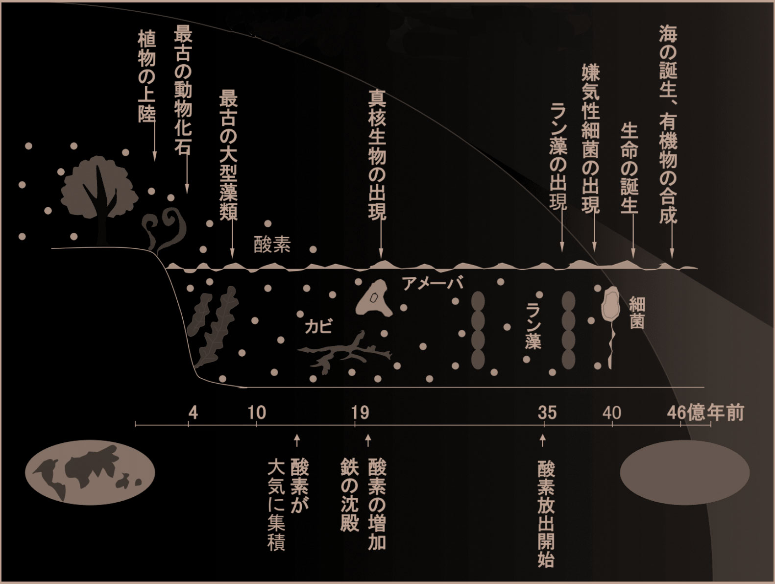 酸素の放出が始まったのは35億年前ですから、そもそも生命体って酸素の無い所で生まれたということになります。酸素がどんどん増えるとアメーバーやカビなどの真核生物が出てきた。そして、大気中にも酸素が放出されるようになると今度は真核生物が集結して、生物は陸上にも棲めるようになった。これがほんの2億年前の話。それまではほとんどの生命体は海の中にいたんですね。海水っていうのは生命の源なんです。