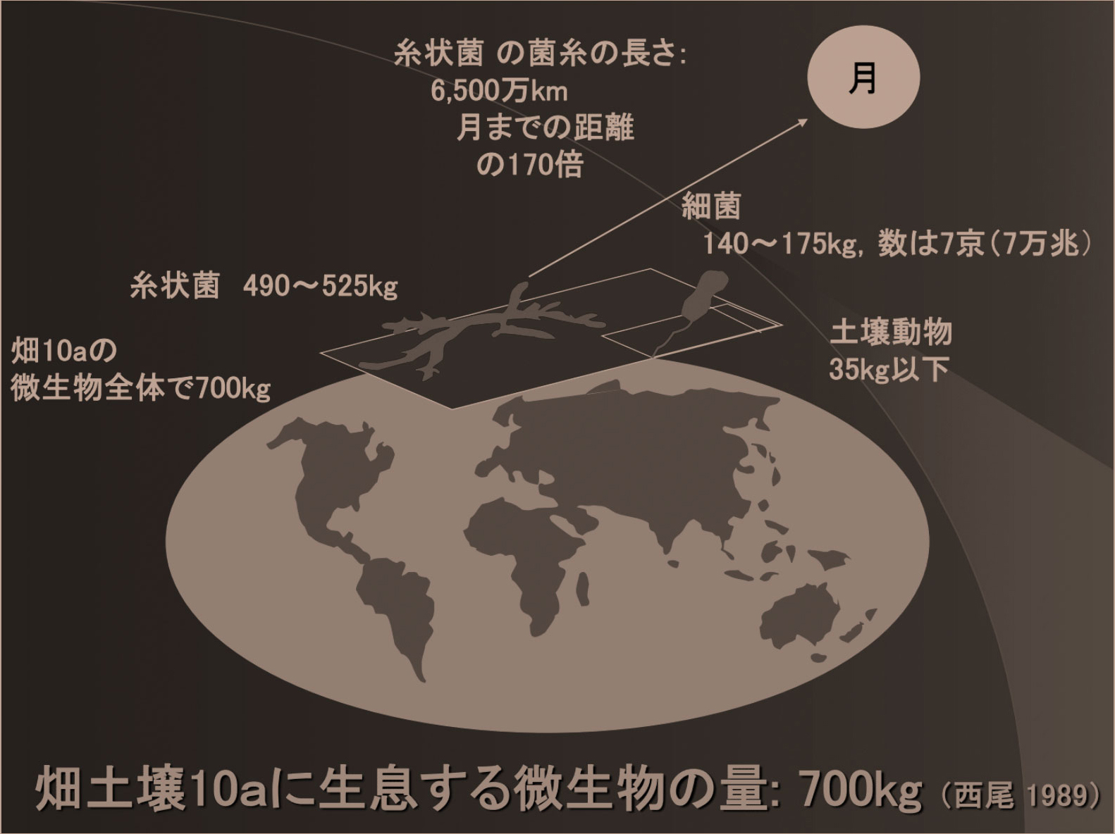 土の中にどのくらいの微生物が生息しているかというと、いい土ならば1グラムに1憶ぐらいは棲んでいます。畑の土壌10アールに生息する微生物の量は約700キログラムもあり、それだけ土の中は微生物の宝庫であり、酵素の塊だともいえます。