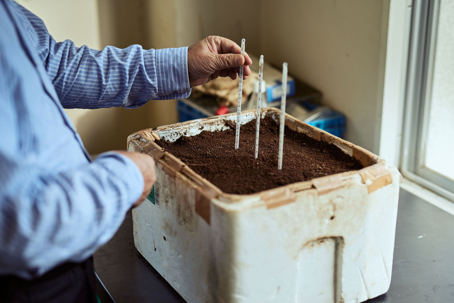 金澤教授:最初は自然から採取して、それを大事に増やしていきます。微生物は温度が10度上がると反応スピードが約2倍になる。だからものすごいスピードで完熟までいっちゃう。完熟とは温度が上がって堆肥化された状態です。土が未熟だと土の中にいる病原菌が全体に広がっちゃうんです。広がらないために完熟させるのが肝心。
