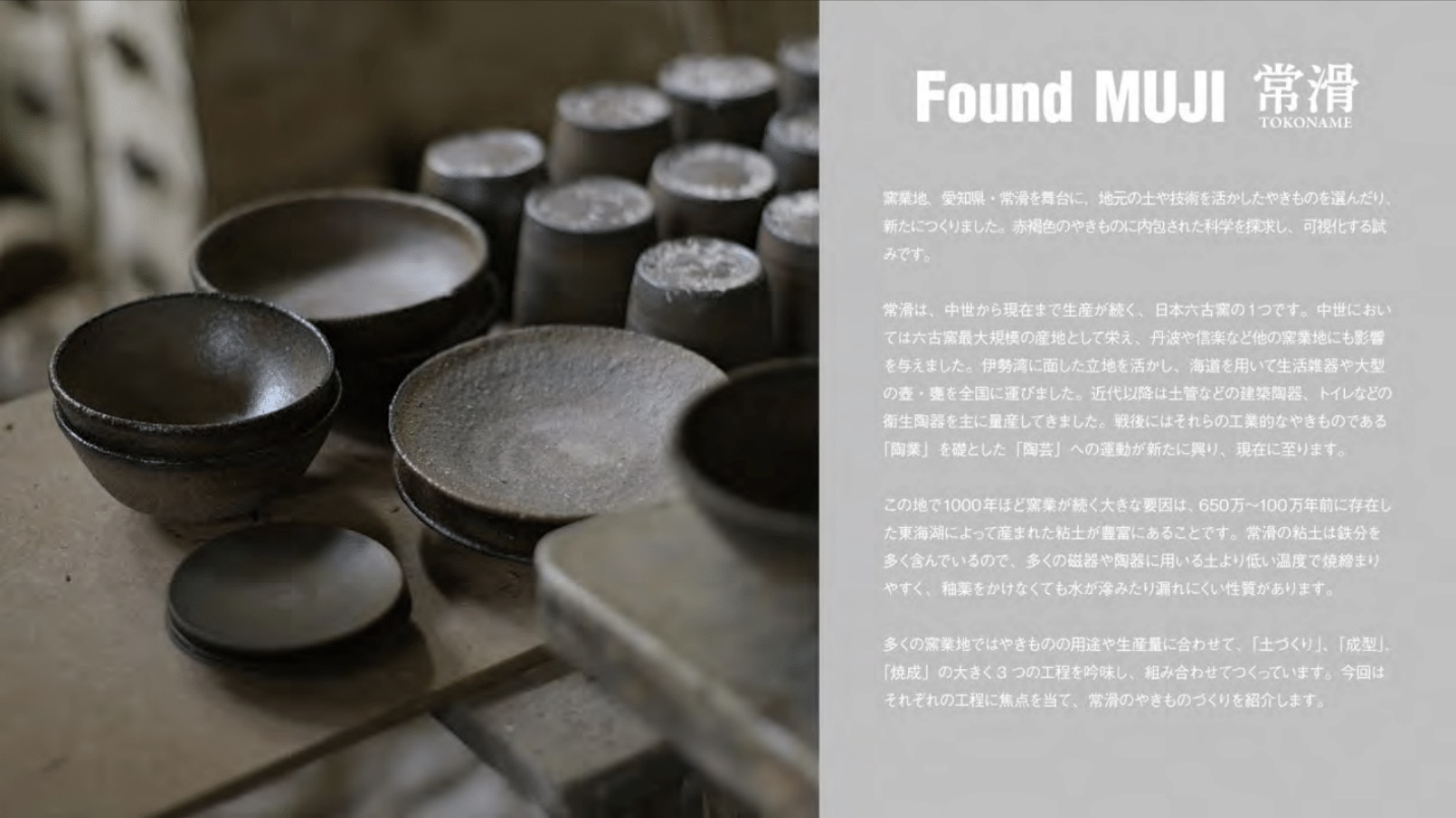 2022年には、無印良品の企画展「FOUND MUJI」で「土づくり」「成型」「焼成」の3工程に焦点を当て、常滑のやきものづくりを紹介。作り手と対話をしながら地元の土や技術を活かしたやきものを選んだり、新たにつくったりしました。赤褐色のやきものに内包された科学を探求し、可視化する試みでもありました。