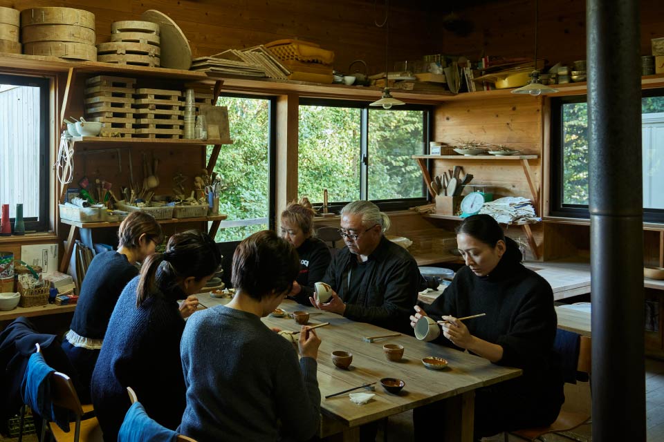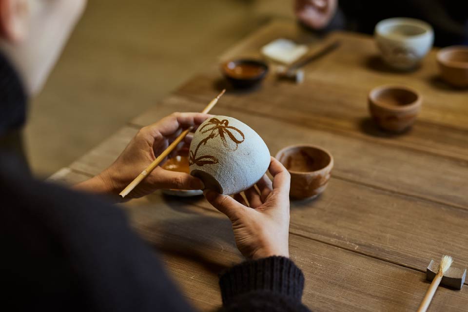 唐津湾を見下ろす高台に建つ健太郎窯。唐津焼の新進気鋭の作家、村山健太郎さんが2008年に開いた窯です。粘土や釉薬などの材料は全て周囲の山でとれたものから自作し、材料に適した温度や焼き方を研究してきた村山さん。通常2日かかる窯焼きを半日で行える、独自の土を開発しました。成形した器に絵付けをし、薪を割り、窯を作り、炎から器が生まれる瞬間に立ち会う、新しい陶芸体験が待っています。作業の合間には、世界に日本のお茶文化の素晴らしさを発信するブランド「EN TEA」のお茶から、4種類のお茶をペアリング。体験の工程に合わせて提供される様々なお茶とその効用をお楽しみください。
