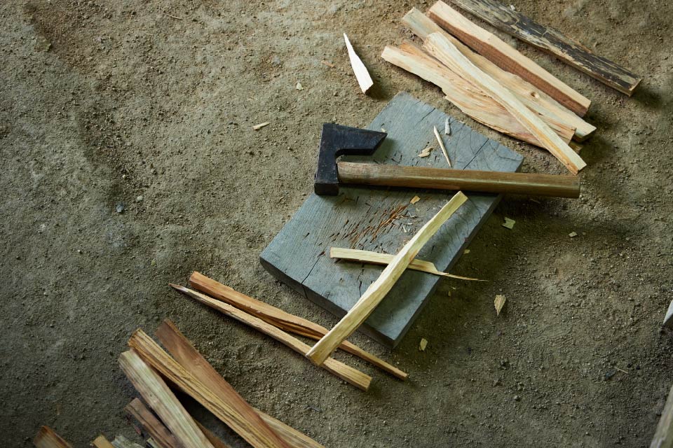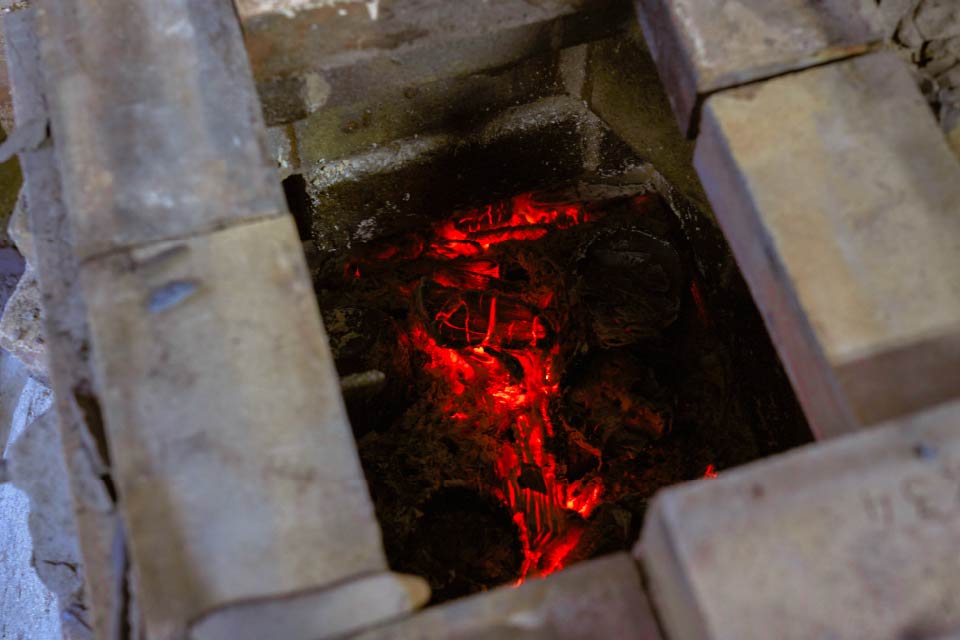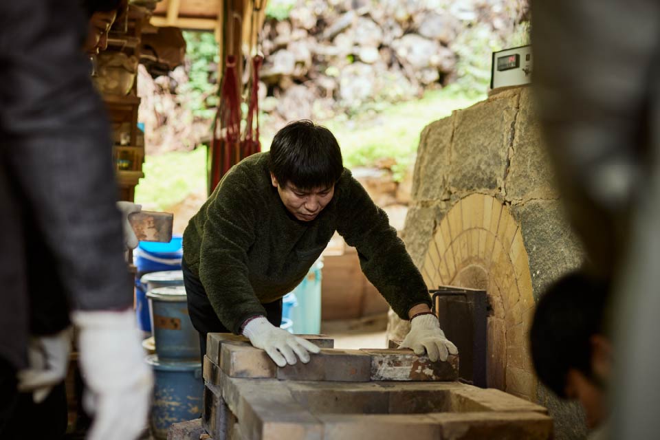 自ら割った蒔の周辺に煉瓦で窯を作り、火入れをして窯焚きを行います。